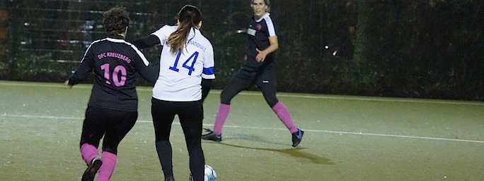 Am Montagabend besiegte der DFC Kreuzberg die Vertretung des FC Internationale 1980 II in einem Nachholspiel der Bezirksliga Staffel 1 (Frauen) mit 4:1 (1:1). Wright hatte die Kreuzbergerinnen in der ersten Halbzeit in Führung gebracht (14.), doch Pogatschnigg sorgte kurz vor der Pause noch für den Ausgleich (43.). Mit dem 2:1 erneut durch Wright (78.) löste sich dann bei den Gastgeberinnen der Knoten und Hartmann (81.) sowie Goetze (89.) sorgten für die endgültige Entscheidung.