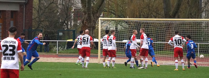 Am Nachmittag bezwang Türkiyemspor im Rahmen des 30. Spieltags der Berlin-Liga Berlin Türkspor mit 3:2 (2:2). Dabei waren die Gäste bereits nach 47 Sekunden durch Bernardes de Almeida in Führung gegangen, dazu musste Türkiyemspor nach 20 Minuten den Ausfall von Kapitän Sanyang verkraften. Dennoch kam die Mannschaft im zweiten Spiel unter der Leitung von Thomas Herbst danach besser ins Spiel und ging sogar bis zur 45. Minute durch ein Eigentor von Brinkmann (31.) und Ulutürk in Führung. Dann aber markierte Bernardes de Almeida mit seinem zweiten Tor des Nachmittags noch den Ausgleich vor dem Pausenpfiff (45.+5). Nach der Gelb-Roten Karte gegen Yildiz (62.) mussten die Kreuzberger die letzte halbe Stunde obendrein in Unterzahl bestreiten – hatten aber dank des direkt verwandelten Freistoßes von Kücük (84., Foto) letztlich doch noch das bessere Ende für sich.