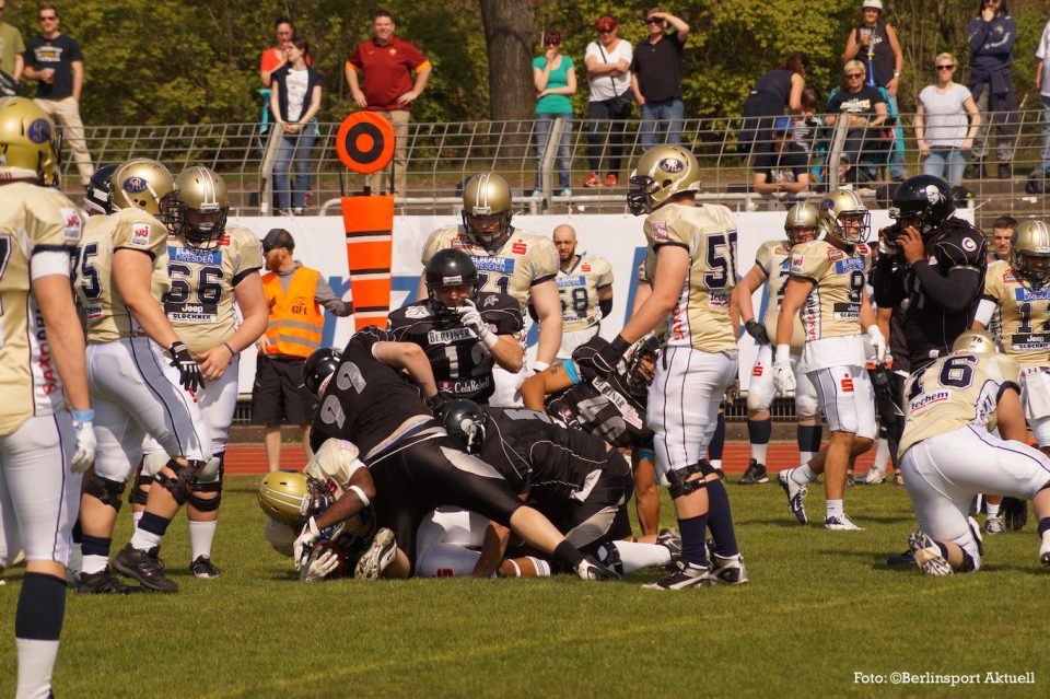 Großes Bild: Selten so was erlebt - Berlin Rebels (schwarze Spielkleidung) und Dresden Monarchs trennten sich letzte Saison im Mommsenstadion unentschieden 21:21