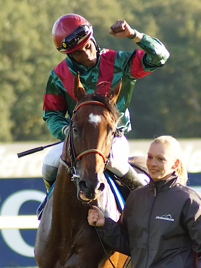 Happy: Alexander Pietsch nach dem Sieg im 4. Rennen mit Julio