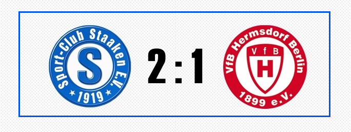 Im Rahmen der Englischen Woche in der Landesliga 1. Abteilung bestritt der SC Staaken II sein Heimspiel gegen den VfB Hermsdorf und blieb am Ende mit 2:1 (1:1) siegreich. Die Gäste waren zunächst durch Ciao (24.) in Führung gegangen, Niemann (41.) gelang jedoch vor der Pause noch der Ausgleich – und im zweiten Durchgang (66.) letztlich auch der Siegtreffer für die Spandauer.