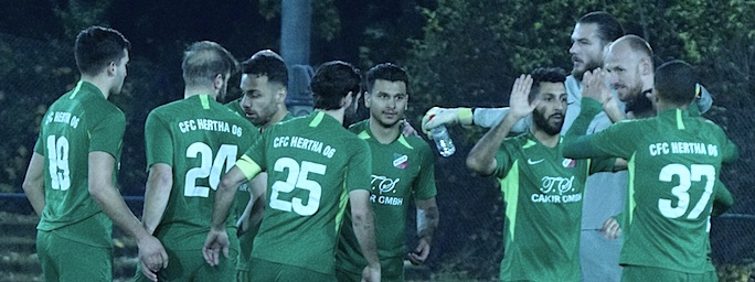 Der CFC Hertha 06 gewann die Neuansetzung des Ligaspiels gegen Stern 1900 am Mittwochabend mit 3:0 (2:0) – die Partie war im September kurz vor Schluss wegen der schweren Verletzung von 06-Spieler Bilal Cubukcu beim Stand von 1:1 abgebrochen worden. Die Treffer gestern erzielten zweimal Atici (14., 61.) sowie Ucar (28.) – damit ist Hertha 06 nun seit zehn Spielen (24 Punkte) ungeschlagen und an der Tabellenspitze bei einem Spiel mehr mit dem Rostocker FC gleichgezogen.