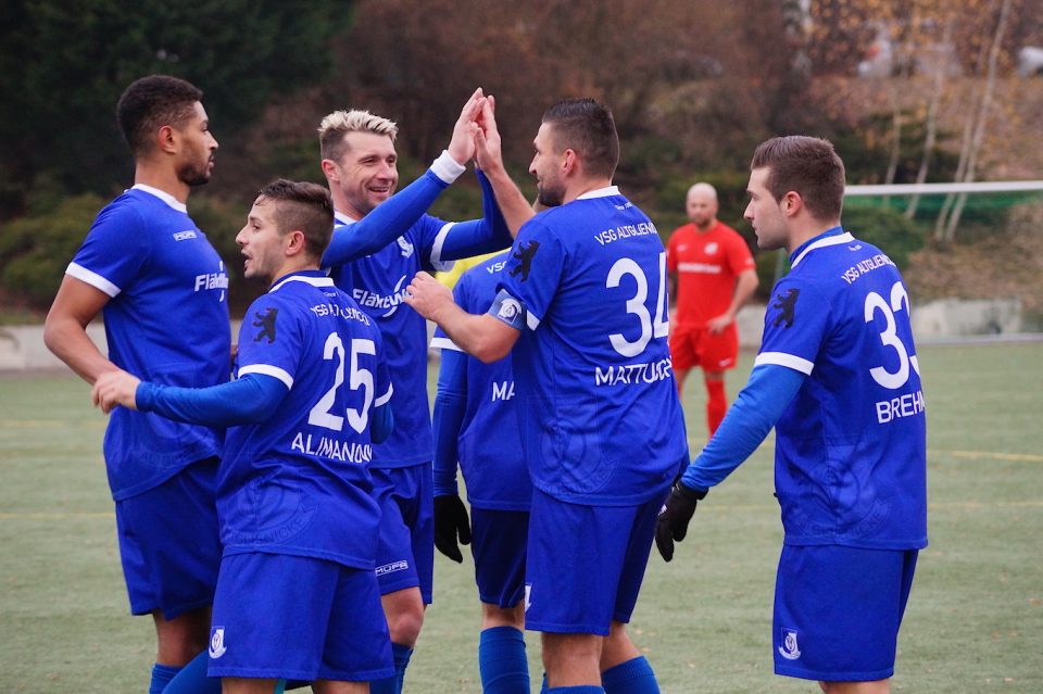Auf zum Aufstieg: Die VSG Altglienicke um ihre Ex-Profis Björn Brunnemann und Torsten Mattuschka (3. u. 4. v. l.) will auch am Ende der Saison jubeln. Foto: ©Berlinsport Aktuell