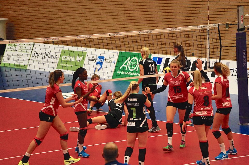 Die Volleyballerinnen des Köpenicker SC (Foto, im Vordergrund) gewannen zum Auftakt der Bundesliga ihr Spiel gegen den VC Olympia mit 3:0 Sätzen (25:21, 25:19, 25:17). Nach Startschwierigkeiten im ersten Satz setzte sich das Team von Trainer Manuel Rieke erwartungsgemäß gegen den Kontrahenten durch, dessen Kader mit dem der deutschen Juniorinnenauswahl identisch ist.